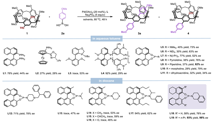 Extensive experiments revealed that classic bisphosphine ligands, such as BINAP (L1), MeOBIPHEP (L4) efficiently catalyzed the reaction, albeit with relatively low ee values (<45%). PHOX (L2) and BIDIME (L3) resulted in low production and poor enantioselectivity. Surprisingly, phosphoramidites (L5-L11) significantly enhanced enantioselectivity and up to 82% ee could be achieved, although the yields were still low (Scheme 1, in aqueous toluene). Further investigation indicated the inferior yields could be attributed to the partial hydrolysis of the OTf rims of 2a, likely due to the relatively high-water content in the toluene-water mixture. After further screening other solvents, 1,4-dioxane effectively suppressed the hydrolysis, increasing the yield to 86% with a slightly inferior ee (78%, Table S2 in Supporting information). With these promising results, other chiral phosphoramidites were further involved (Scheme 1, in dioxane). Finally, in the presence of 40 mol% L19, the desired product 3a was obtained with an impressive 93% yield and 98% ee value. The absolute configuration of 3a is unambiguously determined as all-pS conformation by single-crystal X-ray diffraction analysis (Scheme 2). Notably, once the configuration of one of the five units in the resultant pillar[5]arenes is fixed as pS by the attachment of two bulky rims, the other four units adopt the same planar chiral configuration, resulting in the chirality-aligned all-pS conformer as the most energetically favored enantiomer.