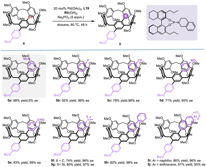 Strikingly, when bulkier aryl, including 4-(F, CF3, NO2, CHO, tBu, or Si(CH3)3)-phenyl, [1,1′-biphenyl]−4-yl, naphthalen-2-yl, and anthracen-2-yl boronic acids were coupled with monosubstituted intermediate 4 under optimized conditions, hetero-rimmed planar chiral pillar[5]arenes (5b-5j) bearing diverse functional groups were synthesized with excellent enantioselectivities (>95% ee, Scheme 3). This success highlights the generality of the strategy for installing sterically demanding axial substituents to achieve stereochemical control.