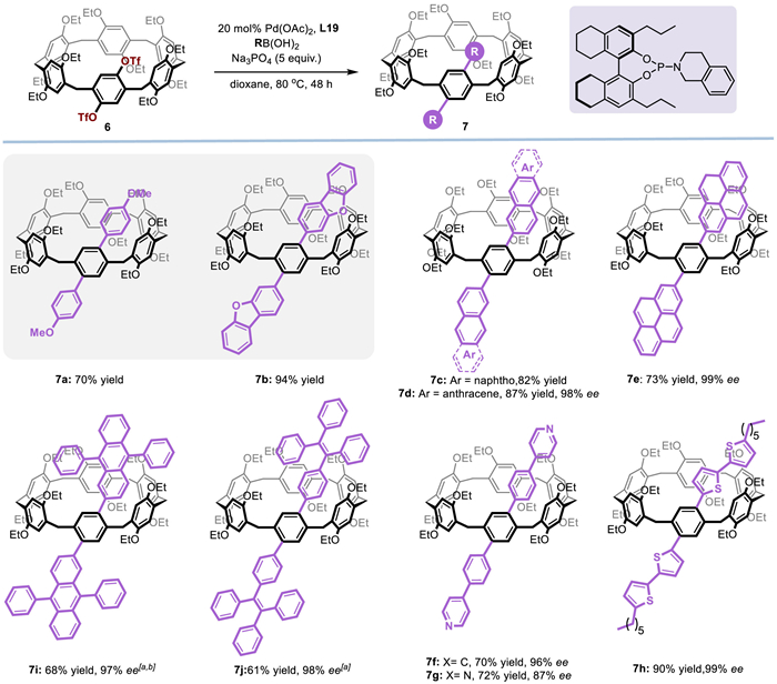 Scheme 4.  Scope of homo-rimmed planar chiral pillar[6]arenes. Reaction conditions: 6 (0.01 mmol), 2 (0.025 mmol), Pd(OAc)2 (20 mol%), Na3PO4 (5.0 equiv.) and L19 (40 mol%) in 1,4-dioxane (2.0 mL) at 80 ℃ under N2 for 48 h. Isolated yield. The ee value was determined by chiral-phase HPLC. a 90 ℃, 48 h, under otherwise identical conditions. b With K3PO4 (5.0 equiv.) under otherwise identical conditions.