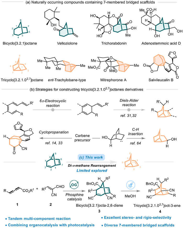 Notably, under visible light irradiation in the presence of a photosensitizer, the bicyclo[3.2.1]octa-2,6-diene bridged-ring derivatives undergo efficient skeletal rearrangement to form the more strained tricyclo[3.2.1.02,7]oct–3-ene framework. This strategy offers an efficient and diverse construction of bridged-ring scaffolds under mild conditions using simple raw materials, not only highlighting significant advances in one-pot, multi-step, highly stereoselective construction of multiple C—C bonds through organocatalysis but also developing a photocatalytic strategy for efficient transformation between complex bridged rings.