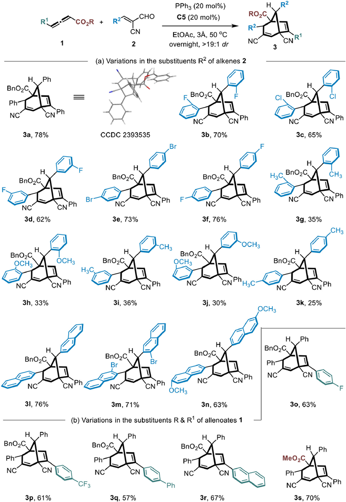 This versatility facilitates the formation of bridged products 3o3q, achieving moderate yields of 57% to 63%. Substituting the benzene ring with a naphthalene ring and replacing the benzyl ester with a methyl ester in the allenoate both demonstrate strong reactivity. These modifications successfully construct the bicyclo[3.2.1]octa-2,6-diene frameworks 3r and 3s, achieving yields of 67% and 70%, respectively.