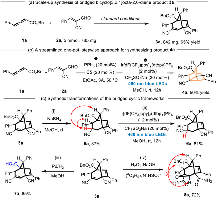 To demonstrate the utility of this method, we conducted a scale-up experiment of the phosphine-catalysed reaction under standard conditions. The bridged framework 3a was successfully constructed with a moderate yield, although scaling up resulted in a slight decrease in yield (Scheme 4a). To streamline the preparation process for the bridged scaffold 4a, we employed a one-pot distributed synthetic strategy. Under standard phosphine catalysis conditions, allenoates 1a and 2a were reacted to yield 3a under phosphine catalysis. The reaction mixture was then directly concentrated, and a photosensitizer along with CF3SO2Na was added to the crude mixture. This was followed by subjecting it to photoreaction conditions at 460 nm. We were pleased to find that the bridged product 4a could be efficiently constructed without the need for intermediate separation (Scheme 4b). Subsequently, we further derivatized product 3a and discovered that NaBH4 could reduce the polar double bond to yield product 5a (Scheme 4c, ), whose relative configuration was determined via NOESY analysis. Interestingly, under photocatalytic conditions, 5a underwent photoinduced α-isomerization of the cyano group to produce 6a (Scheme 4c, ). Furthermore, selective reduction of the benzyl ester of 3a was achieved under Pd/H2 conditions, introducing a carboxylic acid functional group at the bridgehead carbon (7a) without affecting the double bond in the skeleton (Scheme 4c, ). Notably, carboxylic acids with bridged ring skeletons exhibit significant activity in many drug molecules [69], yet their synthesis remains highly challenging. Additionally, product 3a can selectively hydrolyze the CN- groups to amide under oxidative conditions (please see Supporting information for details), while the presence of H2O2 enables epoxidation of the double bond, constructing a bridged ring skeleton with an epoxypropane moiety (8a) (Scheme 4c, iv). This series of intriguing transformations stems from the rich functional groups present in the bridged ring skeleton of 3a, offering numerous possibilities for further research and applications.