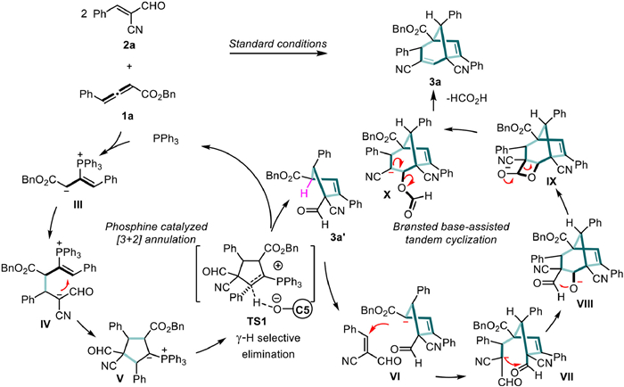 We speculated on the multicomponent reaction process involving allenoates and α-cyano-cinnamaldehyde. As depicted in Scheme 5, the reaction begins with PPh3 attacking the allenoate, forming a zwitterionic intermediate . Then, nucleophilic attack at the α-position of constructs a cyclopentane intermediate . Finally, through the pathway of γ-H elimination, PPh3 is removed, entering the catalytic cycle. The [3 + 2] cyclization product 3a', due to the acidic hydrogen at the α-position of the ester group, can continue to undergo 1,4-addition with a second molecule of α-cyano-cinnamaldehyde 2. Subsequently, the carbanion of attacks the aldehyde carbonyl group to form , completing the [5 + 2] cyclization. Due to the presence of an adjacent aldehyde group, the alkoxide ion attacks the aldehyde group again, generating an oxetane hemiacetal. Through electron transfer, a series of reactions including acyl migration and formic acid removal are realized, ultimately yielding the bridged-ring product 3a. This coherent reaction sequence illustrates the complexity and precision in synthesizing bridged-ring compounds.