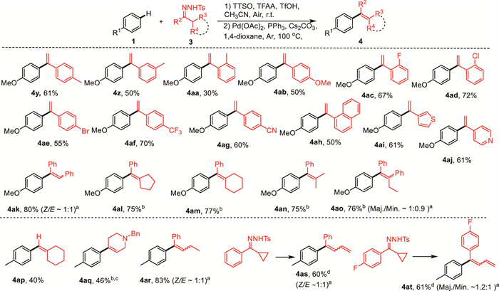 Scheme 3.  Reaction scope of N-tosylhydrazones. Reaction conditions: (1) 1 (0.10 mmol, 1.0 equiv.), TTSO (0.11 mmol, 1.1 equiv.), TFAA (0.30 mmol, 3.0 equiv.), TfOH (0.11 mmol, 1.1 equiv.), and CH3CN (0.40 mL) under air for 12 h at r.t.; (2) 3 (0.18 mmol, 1.8 equiv.), Pd(OAc)2 (0.005 mmol, 5 mol%), PPh3 (0.01 mmol, 10 mol%), Cs2CO3 (0.4 mmol, 4.0 equiv.), and 1,4-dioxane (1.0 mL) under Ar for 24 h at 100 ℃. Isolated yields. a The ratio of E/Z selectivity was determined by the 1H NMR. b PCy3 instead of PPh3. c At 120 ℃. d 3 (0.27 mmol, 2.7 equiv.), Pd(OAc)2 (0.01 mmol, 10 mol%), PPh3 (0.02 mmol, 20 mol%), Cs2CO3 (0.50 mmol, 5.0 equiv.). TTSO: thianthrene S-oxide.
