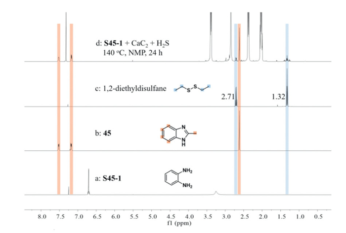 Figure 1.  1H NMR investigation of S45–1 (a), 45 (b), 1,2-diethyldisulfane (c), and the reaction of S45–1, CaC2, and H2S in NMP at 140 ℃ for 24 h (d).
