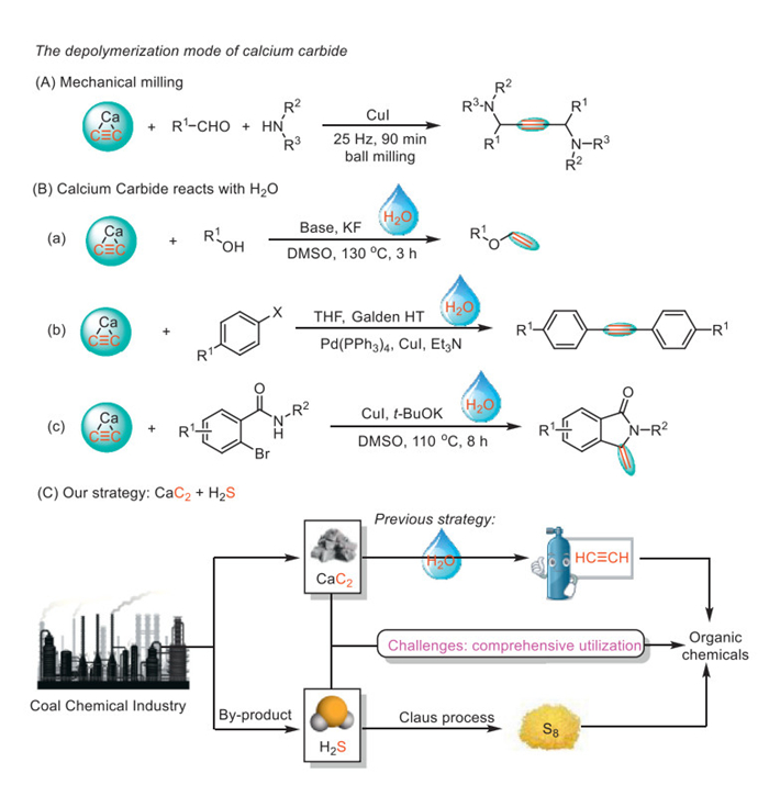 • Calcium carbide (CaC2) is a crucial product in the coal chemical industry, primarily serving as a fundamental raw material to produce acetylene, a significant C2 synthon in organic synthesis [1,2]. However, the flammable and explosive nature of acetylene gas presents substantial challenges for its storage, transportation, and transformation. In contrast, CaC2 stands for a green, inexpensive, and safe alternative to acetylene gas, capable of being directly used as an alkyne source to synthesize various organic compounds [39]. Despite its advantages, the direct uptake of CaC2 in organic synthesis is restricted by its high lattice energy and low solubility in organic solvents. Currently, two methods have been identified for the in situ release of acetylene from CaC2: Mechanical disruption via ball milling (Scheme 1A) [1012] and depolymerization with water. CaC2 depolymerized with water is particularly attractive in organic chemistry since it can accommodate a series of downstream transformations, such as addition [1316], coupling [1721], and cyclization reactions [2227] (Scheme 1B). Despite the advancements, the current methods for the utilization of CaC2 remain relatively limited. Hydrogen sulfide (H2S), a toxic and harmful gas by-product of the coal chemical industry [28], has not been efficiently utilized or treated in industrial processes (Scheme 1C). Typically, H2S is converted into sulfur through the Claus process, leading to minimal economic benefits [29,30]. Therefore, a novel strategy to utilize H2S as a valuable sulfur resource for synthesizing sulfur-containing fine chemicals remains an important yet unmet need.