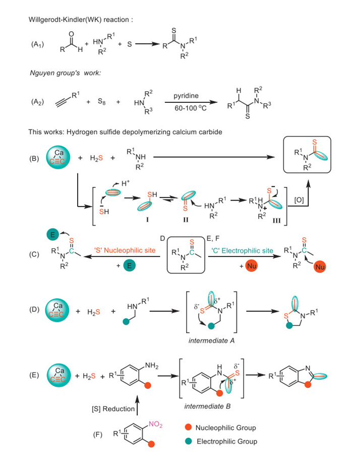 Following the strategy to in situ generate acetylene and HS enabled by depolymerization of CaC2 with H2S, it is speculated that the nucleophile HS attacks acetylene to form an ethenethiol intermediate (Scheme 2B), which would tautomerize to the more stable ethanethial . By introducing amines, ethanethial undergoes an addition reaction with amines to form the intermediate , and then is oxidized to yield thioamides. Furthermore, the sulfur atom of thioamides exhibits nucleophilicity, while the carbon atom shows electrophilicity, allowing the further versatile addition cascades (Scheme 2C). As a proof of concept, three types of novel tandem reactions involving CaC2, H2S, and various substrates were developed to construct structurally diverse heterocyclic compounds (Schemes 2D-F).
