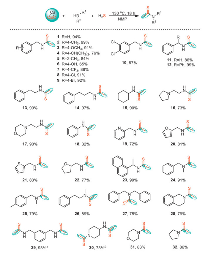 Scheme 3.  Synthesis of various thioamides from amine with CaC2 and H2S. Reaction conditions: Amine (1.0 mmol), CaC2 (3.0 mmol), H2S (6.0 mmol), NMP (2.0 mL) at 130 ℃ for 18 h. Isolated yield. a S29: 1,3-phenylenedimethanamine (0.5 mmol); b S30: piperidin-4-amine (0.5 mmol).
