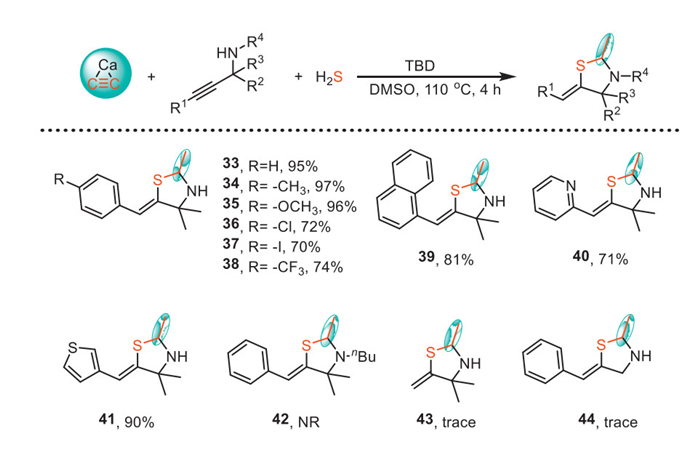 Thioamides, which feature both nucleophilic sulfur and electrophilic carbon sites, serve as crucial intermediates in organic synthesis. To explore their reactivities, a series of tandem reactions were designed to react with electrophiles or nucleophiles. Leveraging the nucleophilicity of the sulfur atom, electrophilic groups such as alkynes can be introduced to synthesize 2-methyltetrahydrothiazole derivatives (Scheme 2D). Therefore, a three-component reaction of 2-methyl-4-phenylbut-3-yn-2-amine (S33), CaC2, and H2S was used as the model reaction to synthesize 5-benzylidene-2,4,4-trimethylthiazolidine (33). The optimal conditions for the reaction of S33 with CaC2 and H2S were established (Tables S4-S9 in Supporting information). Under these optimized conditions, the substrate scope was systematically investigated (Scheme 4). A wide range of primary propargyl amines were compatible with the protocol, producing the 2-methyltetrahydrothiazole derivatives in good to excellent yields (33–41). Unfortunately, steric hindrance posed by the N-Bu group in propargylamine (S42) impeded the formation of the corresponding product 42. Furthermore, when a terminal alkyne without an aromatic group (R1) was used as substrate (S43), no target product was obtained (43). These experimental results suggest that the presence of an aromatic ring may enhance electron delocalization in alkynes, promoting electrophilic addition. In contrast, the aromatic ring replaced with a hydrogen atom would hinder the formation of the desired product. Moreover, when the methyl groups of R2 and R3 were replaced with hydrogen atoms, the target product 44 could not be obtained either. These findings indicate that our method is significantly influenced by the Thrope−Ingold effect [44] and is more suitable for propargyl amines with bulky R2 and R3 substituents.