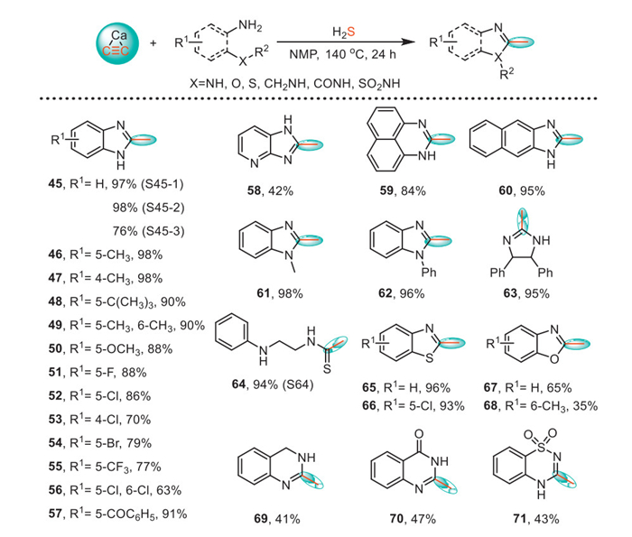 Additionally, for some nucleophilic substrates with two nucleophilic moieties, like o-phenylenediamine, one of the amino groups can react with CaC2 and H2S to yield thioacetamide. Subsequently, the other amino group can undergo an intramolecular nucleophilic attack on the carbon atom of the thioacetamide, leading to the formation of 2-methylbenzoimidazole derivatives (Scheme 2E). The optimal reaction conditions for the synthesis of 2-methylbenzimidazole (45) were obtained, in which o-phenylenediamine (S45–1) was chosen as the model substrate to react with CaC2, and H2S (Tables S10-S13 in Supporting information). Under these optimized conditions, the reactions of CaC2 and H2S with various substrates were investigated (Scheme 5). It was observed that o-phenylenediamine with either electron-donating or electron-withdrawing groups produced the desired products in moderate to excellent yields (45–57). Only moderate yields of 2-methyl-1H-imidazo[4,5-b]pyridine (58) were obtained when 2,3-diaminopyridine was employed as a substrate. This lower yield may be attributed to the lower nucleophilicity of the amino group on the pyridine ring. When both naphthalene-1,8-diamine and naphthalene-2,3-diamine are used as substrates, the reaction proceeds unaffected, yielding the target product with excellent efficiency (59, 60). Notably, o-phenylenediamine contained N-methyl or N-phenyl could react with CaC2 and H2S to produce the target product in excellent yields (61, 62). However, the amino group containing protecting groups, such as N-acetyl (S45–2) or N-Boc (S45–3), only the 2-methylbenzimidazole (45) was generated, whereas the target product containing protecting groups was not obtained. It is speculated that the alkaline reaction conditions may remove these protecting groups. For aliphatic diamines, such as 1,2-diphenylethane-1,2-diamine (S63), the product imidazoline (63) can also be achieved in high yields. However, the N1-phenylethane-1,2-diamine (S64) can not react with CaC2 and H2S to produce the target product imidazoline, and only the N-(2-(phenylamino)ethyl)ethane-thioamide (64) is produced. This result demonstrates that the weak nucleophilicity of the amino group in aniline prevents the intramolecular cyclization to form the imidazoline product. Additionally, 2-aminobenzenethiol derivatives react with CaC2 and H2S to produce the benzothiazole derivatives in excellent yields (65, 66). When 2-aminobenzenethiol is replaced with o-aminophenol, the 2-methylbenzoxazole derivatives are obtained only in medium yield due to the weaker nucleophilicity of the oxygen atom (67, 68). Similarly, when 2-(aminomethyl)aniline, 2-aminobenzamide, or 2-aminobenzenesulfonamide is used as the starting material, the target product is obtained only in moderate yields (69–71).