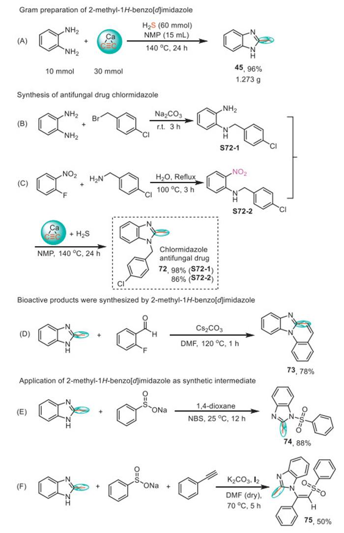 To demonstrate the scalability of this synthetic method, the gram-scale synthesis of 45 was performed (Scheme 6A). When 10 mmol of o-phenylenediamine (S45–1) was employed to react with CaC2 and H2S under optimized conditions, the desired product 45 was obtained in 96% yield (1.273 g), highlighting the potential utility of our protocol. To further illustrate the practical applicability of this method, an antifungal drug Chlormidazole [49] was successfully synthesized in high yield by the reaction of N1-(4-chlorobenzyl)benzene-1,2-diamine (S72–1) or N-(4-chlorobenzyl)-2-nitroaniline (S72–2) with CaC2 and H2S under optimized reaction conditions (Schemes 6B and C). Additionally, 2-methylbenzimidazole can be exploited as a key intermediate for synthesizing value-added scaffolds. For example, benzo[4,5]imidazo[1,2-a]quinoline (73) [50], 2-methyl-1-(phenylsulfonyl)-1H-benzo[d]imidazole (74) [51] and (Z)-2-methyl-1-(1-phenyl-2-(phenylsulfonyl)vinyl)-1H-benzo[d]imidazole (75) [52] were synthesized through nitrogen atom functionalization (Schemes 6D-F). These results further demonstrate the practicality and versatility of this synthetic method, making it a promising approach for industrial applications.