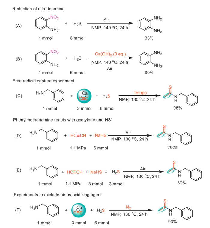 In summary, a novel strategy for the depolymerization of CaC2 using H2S has been developed. This strategy paves the way for an efficient and catalyst-free approach to synthesize thioamides. Based on this strategy, two types of tandem reactions have been designed as a proof of concept. These reactions take advantage of the nucleophilic sulfur site and the electrophilic carbon site of thioamides to construct various heterocycles. Specifically, utilizing the nucleophilic sulfur site, a new method has been developed for synthesizing 2-methylthiazole derivatives through the reaction of CaC2, H2S with propargylamines contain both a nucleophilic group (-NH2) and an electrophilic group (C≡C). Additionally, by exploiting the electrophilic carbon site of thioamides, substrates with dual nucleophilic groups can react with CaC2 and H2S to establish a tandem reaction for the synthesis of 2-methylbenzimidazole derivatives. Leveraging the reducibility of H2S, a new multi-step tandem reaction for synthesizing 2-methylbenzimidazole compounds has been established by the reduction of common industrial products such as 2-nitroaniline. Although this synthetic strategy successfully enables the safe, green, and efficient conversion of CaC2 and H2S into high-value organic chemicals, it currently has some limitations. The reaction requires high temperatures, and substrates with weak nucleophilicity (e.g., aromatic amines) show limited reactivity under these conditions. Future efforts will focus on optimizing the reaction parameters by selecting appropriate catalytic systems, aiming to achieve milder reaction conditions and broaden the scope of applicable substrates.