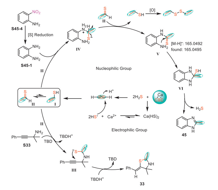 Based on the aforementioned experimental results, a plausible mechanism is proposed in Scheme 8. Initially, CaC2 reacts with H2S to generate acetylene and Ca(HS)2, which can simultaneously release Ca2+ and HS. Subsequently, HS nucleophilically attacks acetylene to form the ethenethiol intermediate , which is prone to tautomerize into more stable ethanethial . Ethanethial, as a key intermediate, reacts with nucleophilic or electrophilic substrates via two distinct cascade strategies to construct different heterocycles. In the first route, 2-methyltetrahydrothiazole is synthesized from a tandem three-component reaction of propargylamine (S33), CaC2 and H2S. After ethanethial is produced from CaC2 and H2S, it is nucleophilically attacked by the amino group of S33 to generate intermediate under basic conditions. Subsequently, the intermediate undergoes intramolecular electrophilic addition to form 5-benzylidene-2,4,4-trimethylthiazolidine (33). Similarly, in the second route, 2-methylbenzoimidazole is synthesized via a tandem three-component reaction of CaC2, H2S and o-phenylenediamine (S45–1) or 2-nitroaniline (S45–4). Initially, 2-nitroaniline is reduced by H2S to produce o-phenylenediamine, which then attacks intermediate which is generated from CaC2 and H2S to produce intermediate . Intermediate is then oxidized by intermediate to form thioamide (which could be detected by HRMS) and ethanethiol. Notably, ethanethiol is easily oxidized to form 1,2-diethyldisulfane. Due to the strong electrophilicity of the carbon atom in the C=S bond of thioamide , another amino group nucleophilically attacks C=S bond in an intramolecular manner, leading to the formation of intermediate . Finally, intermediate efficiently eliminates H2S to produce 2-methylbenzimidazole (45) as the final product.
