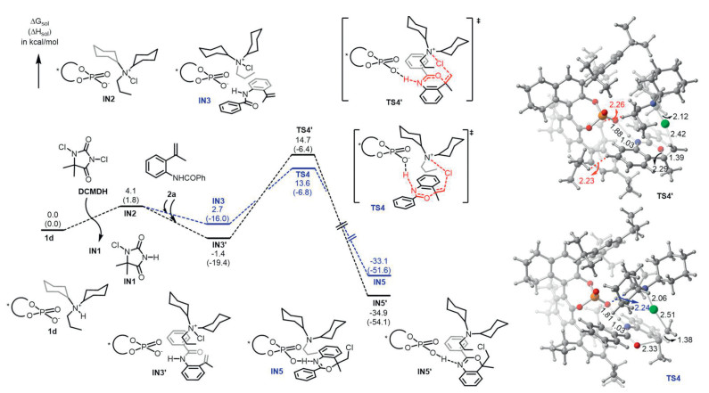 To gain insights in the reaction mechanism and the origins of enantioselectivity, we have performed density functional theory studies. The ammonium salt 1d, aniline 2a, and DCDMH were used as the catalyst, substrate, and chlorinating reagent, respectively, in our calculations. As shown in Fig. 1, the complexation of 1d and DCDMH would lead to IN1 and IN2, in which the chlorine has bound to nitrogen in the latter. This step is slightly endergonic by 4.1 kcal/mol and there are multiple C-HO hydrogen bonding interactions between the phosphate anion and the ammonium cation. Following that, the binding of substrate 2a would form isomeric species IN3 and IN3’, which are exergonic by 1.4 and 5.5 kcal/mol, respectively. Starting from IN3, the asymmetric chlorocyclization occurs via transition state TS4 to generate IN5. This process has an activation free energy barrier of 15.0 kcal/mol and is exergonic by 31.7 kcal/mol (with respect to IN3’). On the other hand, from IN3’, the minor pathway takes place through TS4’ to provide IN5’. This pathway has an activation free energy barrier of 16.1 kcal/mol and is exergonic by 34.9 kcal/mol. By comparison, the pathway leading to the major enantiomer (via TS4) is 1.1 kcal/mol more favorable than that leading to the minor enantiomer (via TS4’), which is consistent with experiment (i.e., 99% ee). By detailed analyses on the selectivity-determining transition state, we found that there was favorable hydrogen bonding interaction between phosphate oxygen and the ammonium C-H bond (OH = 2.24 Å) in TS4. In addition, there were much pronounced steric repulsions between phosphate anion and the aniline substrate part in TS4’ (i.e., the shortest HH distances are 2.23 and 2.26 Å). Therefore, the hydrogen bonding interaction and the steric effect account for the observed high enantioselectivity.
