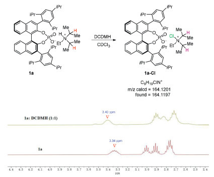 To get a better understanding of the catalytic system, we attempted to probe the active species (Scheme 6). Upon mixing 1a and DCDMH in CDCl3, a new proton signal at 3.40 ppm appeared which might be due to species 1a-Cl, further evidenced using ESI high-resolution mass spectrometry. This active species 1a-Cl was vital for the asymmetric induction which the phosphate anion interacts with tertiary ammonium cation tightly via electrostatic and multiple electropositive hydrogens interact with the phosphate oxygens.