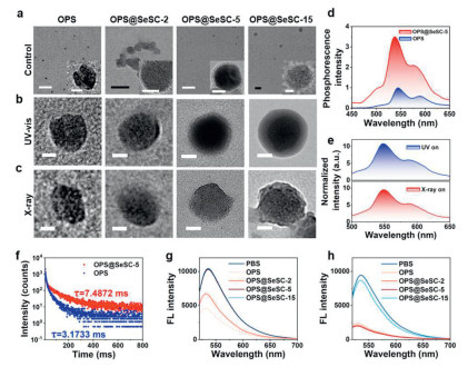 Figure 1.  Characterization of surface-engineered organic phosphorescent nano-scintillator. (a) TEM images of OPS, OPS@SeSC-2, OPS@SeSC-5, OPS@SeSC-15. Scale bar: 500 nm (20 nm in inserted figures). (b, c) TEM images of OPS, OPS@SeSC-2, OPS@SeSC-5, OPS@SeSC-15 with UV–vis light irradiation (10 min) and 2 Gy X-ray irradiation. Scale bar: 20 nm. (d) Phosphorescence spectra of OPS@SeSC-5 under excitation at 340 nm. (e) Radioluminescence spectra of OPS@SeSC-5. (f) Time-resolved decay profile of phosphorescence emission wavelength at 544 nm. (g, h) The fluorescence spectra of SOSG in OPS@SeSC-5 solution (g) with UV–vis light irradiation (10 min), and (h) with 2 Gy X-ray irradiation.