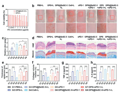 Figure 2.  Evaluation of phototoxicity and cutaneous irAEs. (a) Cell viability of MSF cells treated with OPS or OPS@SeSC-5 with LED (50 mW/cm2) irradiation for 10 min. (b) Skin photosensitivity of mice treated with formulations at 4 days. (c) Weight of the irradiated skin samples 1.5 cm × 1.5 cm in size at 4 days post-light irradiation. (d) H&E-stained and Masson-stained analysis of the irradiated skin samples. Scale bar: 20 µm. (e, f) Corresponding quantification of epidermis thickness and collagen content. (g, h) Levels of pro-inflammatory cytokines, including TNF-α and IL-6 on day 3. All data are the mean ± SD (n = 3). *P < 0.05, **P < 0.01, ***P < 0.001, ****P < 0.0001.