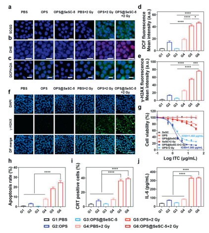 Figure 3.  In vitro ROS generation and anti-tumor effect of OPS@SeSC-5-mediated RDT. (a) The fluorescence signal of SOSG in the treated 4T1 cells in darkness or with 2 Gy irradiation. SOSG: green; 4′, 6-diamidino-2′-phenylindole (DAPI): blue. (b) The fluorescence signal of dihydroethidium (DHE) in the treated 4T1 cells in darkness or with 2 Gy irradiation. DHE: red; DAPI: blue. (c) The fluorescence signal of 2′, 7′-dichlorodihydrofluorescein diacetate (DCFH-DA) in the treated 4T1 cells in darkness or with 2 Gy irradiation. DCFH-DA: green; DAPI: blue. Scale bar: 20 µm. (d) Quantitative data on the average fluorescence intensity of DCFH-DA under different treatments. (e) Quantitative data on the average fluorescence intensity of γ-H2AX under different treatments. (f) Representative immunofluorescence images of γ-H2AX in the treated 4T1 cells after 2 Gy of radiation. γ-H2AX: green; DAPI: blue. Scale bar: 50 µm. (g) Cell viabilities of 4T1 cells. (h) Late apoptosis rate of 4T1 cells under different treatments. (i) CRT expression in the treated 4T1 cells. (j) The secretion levels of IL-6 in BMDCs. Data represent mean ± SD. *P < 0.05, ***P < 0.001, ****P < 0.0001.