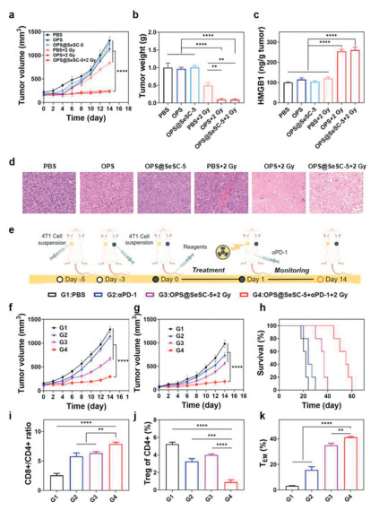 Figure 4.  Therapeutic efficacy of OPS@SeSC-5-mediated RDT and synergistic RDT-immunotherapy in vivo. (a) Tumor growth curves and (b) tumor weights in each group. (c) HMGB-1 expressions in tumor. (d) Representative images of H&E-stained tumor slices after various treatments. Scale bar: 100 µm. (e) Scheme of RDT-immunotherapy treatment options in vivo. (f, g) Distant tumor and proximal tumor growth curves after different treatments (n = 3). (h) Survival rates (n = 5). (i, j) Ratio of CD8+/CD4+ cell (i) and population of Treg cell (j) in distant tumor after 10-day treatment. (k) Effective memory T cell (TEM) levels in the spleen after 20-day treatment. Data are represented as mean ± SD. **P < 0.01, ***P < 0.001, ****P < 0.0001.