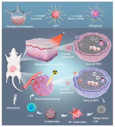 Scheme 1.  Schematic illustration of a photoswitchable RDT system mediates by surface-engineered organic phosphorescent nano-scintillator (OPS@SeSC) that can controllably generate ROS to potentiate cancer immunotherapy and diminish the risk of cutaneous irAEs.