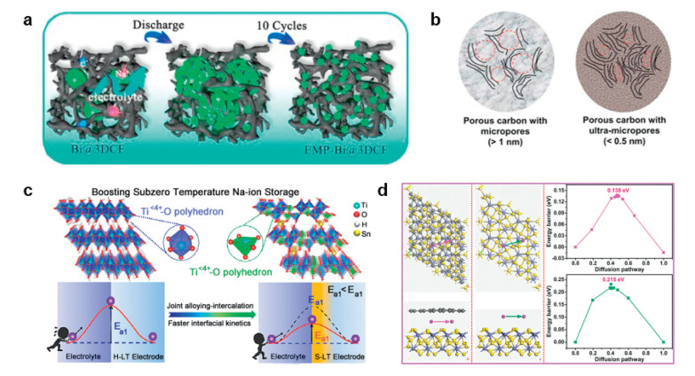 Figure 3 Low temperature sodium-ion battery anode material. (a) Bi@3DCF particle size was reduced to EMP-Bi@3DCF via electrochemical milling process. Copied with permission [28]. Copyright 2021, Elsevier. (b) Micropores and ultrapores of porous carbon. Copied with permission [64]. Copyright 2021, Springer. (c) Due to the induction of Sn, the activation energy of sodium ion diffusion in HTO-Sn decreases. Copied with permission [65]. Copyright 2020, American Chemical Society. (d) Na migration barrier decreases in FeS2@G@CNFs. Copied with permission [66]. Copyright 2019, Wiley.