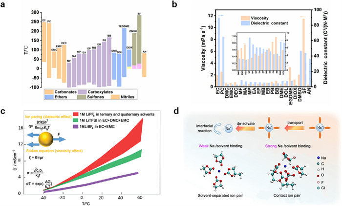 Figure 4 (a) Statistical diagram of melting and boiling points of common solvents. (b) Diagram of common solvents’ dielectric constant and viscosity. (c) Conductivity solvent diagram and dielectric effect viscosity effect formula. Copied with permission [77]. Copyright 2020, Wiley. (d) Solvation structure of Na+ in electrolyte. Copied with permission [29]. Copyright 2022, Elsevier.