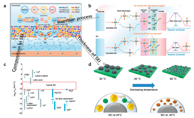 Figure 6 (a) The charge transfer process on the interphase between NVPF cathode and 1.0 mol/L NaClO4 in EC/PC (1/1) + 5 vol% FEC. Copied with permission [29]. Copyright 2022, Elsevier. (b) By introducing co-embedding mechanism, the dissolubilization step is skipped and the diffusion barrier is lowered. Copied with permission [89]. Copyright 2016, Elsevier. (c) Common inorganic substances and ionic conductivity in SEI. Copied with permission [5]. Copyright 2021, Springer Nature. (d) Effect of low temperature on metal deposition and thickness and composition of SEI. Copied with permission [90]. Copyright 2019, American Chemical Society.