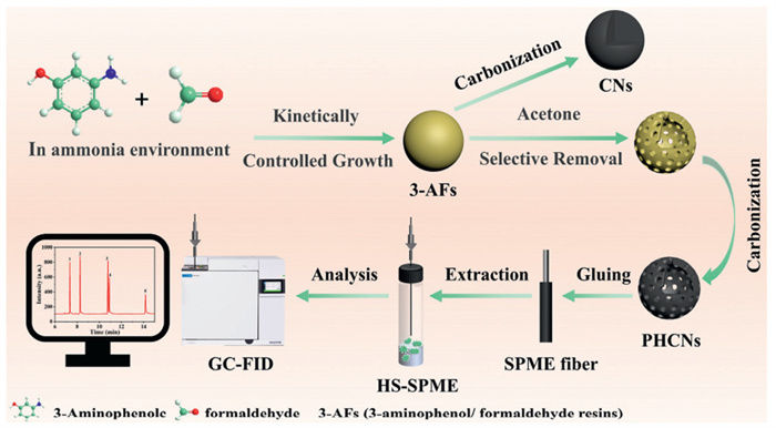 Herein, 3-aminophenol/formaldehyde resins (3-AFs) with good thermal stability and high carbonization yield was used as precursors to form carbon nanospheres with uniform shape. The internal components of carbon nanospheres exhibit inhomogeneity. The porous hollow carbon nanospheres (PHCNs) were obtained by selectively removing the interior part of inhomogeneous nanospheres with acetone and carbonization. This template-free synthetic strategy only relies on resin molecules to form inner compositional inhomogeneity without introducing tedious operations like coating and etching. Compared with solid carbon nanospheres (CNs) obtained by directly carbonizing 3-AF resin molecules, PHCNs possess larger interfaces and defects, higher specific surface area, and more abundant nanopores. For the first time, PHCNs was used as the fiber coating material of SPME. The PHCNs coated fiber of HS-SPME was employed to non-contact extract and preconcentrate trace PAHs in water and honey samples prior to GC-FID analysis.