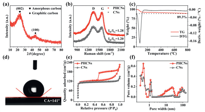 Figure 2.  (a) XRD pattern. (b) Raman spectrum. (c) TGA curve. (d) Contact angle. (e) N2 adsorption-desorption isotherms. (f) Pore size distribution.