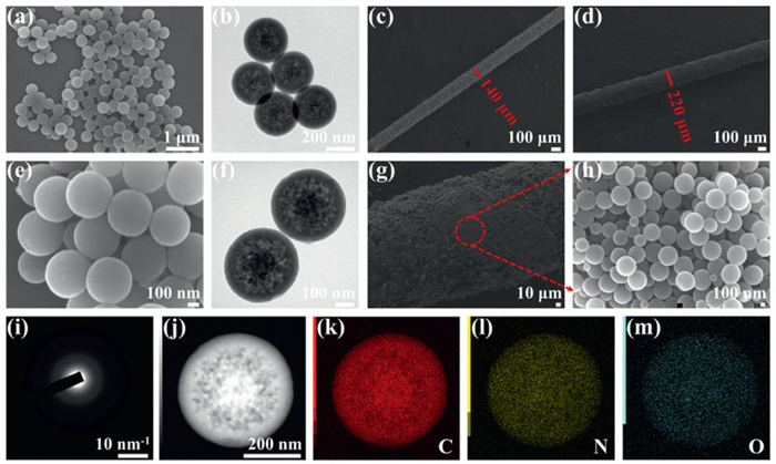 Figure 3  (a, e) SEM images of PHCNs. (b, f) TEM images of PHCNs. (c) bare fiber. (d, g) PHCNs-coated fiber. (h) Surface of SPME fiber coating. (i) SAED result. Mapping analysis of PHCNs (j) and its corresponding element mapping images (k-m: C, N, O).