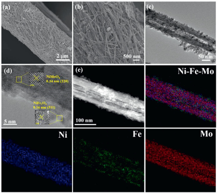 Figure 2.  (a, b) SEM images of NiFe2O4/NiMoO4, (c) TEM image, (d) HRTEM image and (e) STEM image and the corresponding EDS elemental mapping spectra of NiFe2O4/NiMoO4.