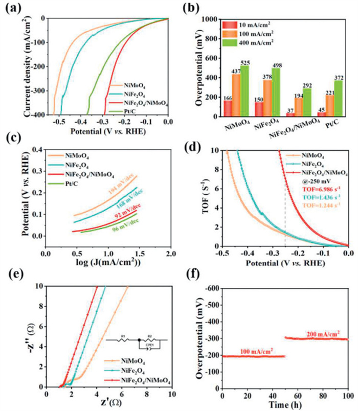 Figure 5  (a) LSV curves for HER, (b) histogram of corresponding overpotential at different current densities, (c) Tafel plots, (d) TOF and (e) Nyquist plots of NiMoO4, NiFe2O4 and NiFe2O4/NiMoO4 electrocatalysts. (f) Chronoamperometric curves of NiFe2O4/NiMoO4 at 100 and 200 mA/cm2 for HER in simulated alkaline seawater (1 mol/L KOH + 0.5 mol/L NaCl).