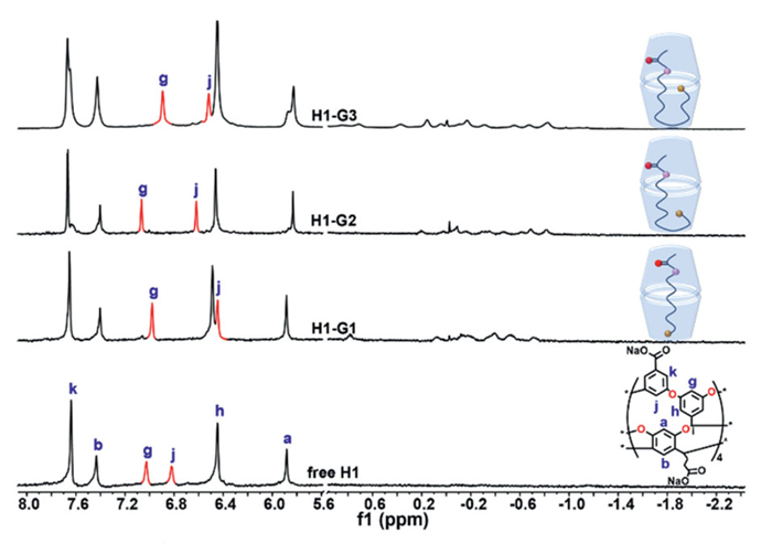 Figure 1.  Partial 1H NMR spectra of H1⊃G1-G3 in D2O ([H1] = 1.0 mmol/L, [G] = 0.5 mmol/L).