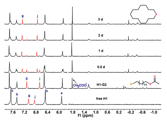 Subsequently, to initiate the reaction, 100 mmol/L NaOH was added to a pre-formed 2:1 host-guest complex, thereby facilitating the subsequent hydrolysis and cyclization process. The ester moiety of the guests underwent hydrolysis to form a thiolate group, which subsequently reacted with the terminal halide moiety on the same alkyl chain to generate a cyclic thioether. The two-step sequential reactions were tracked with 1H NMR. For the H1-G1 complex, as the reaction of G1 progressed, Hg shifted upfield and gradually overlapped with Hj, accompanied by a slight upfield shift of Hk and Ha and a downfield shift of Hb, reflecting the influence of the cyclization product on the host structure. Simultaneously, the number of peaks corresponding to bound G1 gradually decreased, indicating the generation of a symmetrical cyclic product. The complete reaction required approximately 20 days, likely due to the linear conformation where the two terminal residues were anchored at opposing poles of the capsule, thereby reducing their interaction probability (Fig. S11 in Supporting information). In contrast, the H1-G2 complex exhibited significantly faster kinetics, completing within 3 days. During this reaction, both Hg and Hj moved downfield, confirming the progression of cyclization (Fig. 2). Notably, the peak corresponding to hydrolyzed product (CH3COO, 1.8 ppm) gradually emerged and was consistently observed throughout each reaction, providing clear evidence of ongoing hydrolysis processes within the system. The appropriate detection interval for G2 enabled us to monitor its transformation process. Concurrently, the number of peaks corresponding to G2 significantly decreased, strongly suggesting the formation of the cyclization product. Collectively, these observations confirm the occurrence of cascade reaction mechanisms. The rapid kinetics are attributed to G2's folded conformation, which brings reactive groups into closer proximity. Subsequently, the reaction of G3 was also monitored. As anticipated, G3 exhibited the fastest reaction rate, completing the process in less than 12 h. This is attributable to its longer chain length, which promotes the optimal preorganization of reactive termini within the capsule (Fig. S13 in Supporting information). The observed trend of G3 > G2 > G1 in reaction rates is directly correlated with the guests' propensity to adopt folded conformations that facilitate intramolecular ring closure.