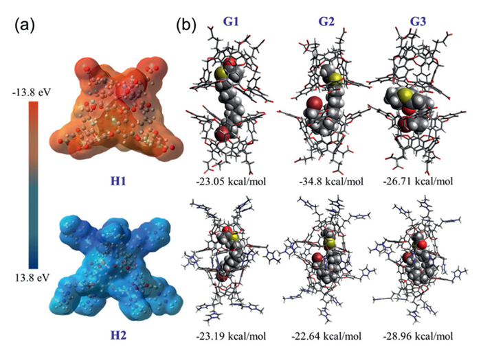 Figure 4  (a) Electrostatic potential surfaces of free hosts. (b) Theoretical computational models of the host-guest complexes with optimal conformations and their interaction energies.
