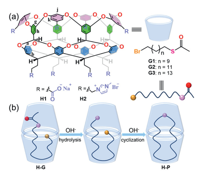 Scheme 1.  (a) The structures of the hosts (H1-H2) and guests (G1-G3). (b) The cascade hydrolysis-cyclization reactions of G1-G3 within the dimeric capsules.