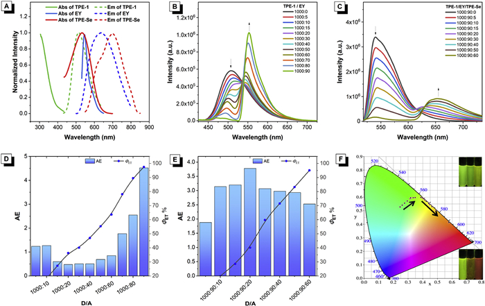 Figure 1  (A) Normalized absorption spectra of TPE-1 (green line), EY (blue line), TPE-Se (red line) and their normalized emission spectra (dashed lines). (B) Fluorescence spectra of TPE-1 with different concentrations of EY. λex = 355 nm, Ex/Em slit = 1/1 nm. (C) Fluorescence spectra of TPE-1/EY (1000:90) with different concentrations of TPE-Se. λex = 355 nm, Ex/Em slit = 1/1 nm. Energy transfer efficiency and AE at (D) different TPE-1/EY ratios, (E) different TPE-1/EY/TPE-Se ratios. (F) Commission International de L'Elairage (CIE) 1931 chromaticity coordinates changes of (B) and (C). Inset: the fluorescence photos of TPE-1, TPE-1/EY and TPE-1/EY/TPE-Se suspension.