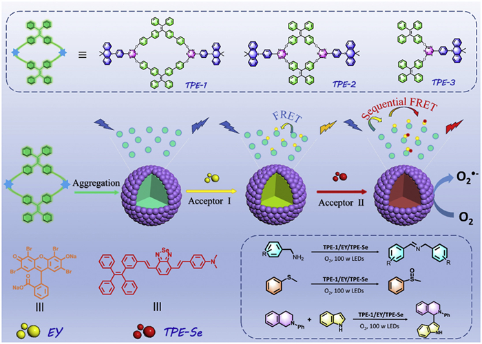 Scheme 1.  Schematic diagram of the energy transfer process and photooxidation reaction based on TPE-1, TPE-2 and TPE-3.