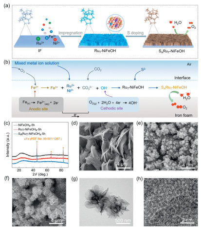 The SARuT-NiFeOHx-5h was synthesized via a stepwise room temperature soaking strategy as described in Fig. 1a. First, Ru modified NiFeOHx supported on iron foam (RuT-NiFeOHx-5h) was achieved through a 5-h impregnation process, which was then used as template to prepare the SARuT-NiFeOHx-5h by introducing S species in a sodium sulfide solution. The mechanism of the above synthetic process was shown in Fig. 1b. Specifically, the surface of the IF first underwent an oxidation–reduction reaction with oxygen, generating a small amount of Fe3+ and OH⁻. When they encountered the added Ru3+ and Ni2+, the four species precipitated and grew attached to the surface of the IF, forming RuT-NiFeOHx-5h sample. During this process, CO2 from the air spontaneously dissolved in the solution to form CO32- species, which acted as a charge-balancing anionic regulator. Additionally, when the RuT-NiFeOHx-5h was soaked in a solution containing sodium sulfide, S2- would combine with Fe3+, Ru3+, and Ni2+ on the surface of RuT-NiFeOHx-5h to form local sulfides, thereby achieving the regulation of the catalytic performance of RuT-NiFeOHx-5h. Throughout the process of synthesizing SARuT-NiFeOHx-5h, the following chemical reactions (Eqs. 1–5) may be involved.