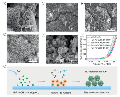 Figure 2.  The influence of the concentration of Ru3+ in the soaking system on the growth process of the RuT-NiFeOHx-5h. SEM images of the RuT-NiFeOHx-5h at different Ru3+ addition levels: (a) 0 mol/L, (b) 0.0001 mol/L, (c) 0.001 mol/L, (d) 0.005 mol/L, and (e) 0.01 mol/L. (f) The polarization curves of RuT-NiFeOHx-5h at different Ru3+ concentrations. (g) Schematic diagram of the synthesis mechanism of RuT-NiFeOHx-5h catalyst.