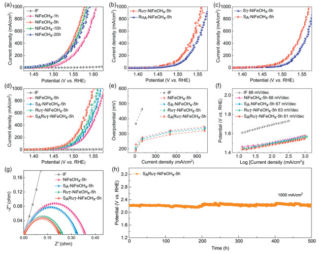 Figure 3.  (a) Polarization curves of NiFeOHx with different immersion time with iR compensation. (b) Comparison of polarization curves of NiFeOHx-5h with diverse Ru3+ doping methods with iR compensation. (c) Comparison of polarization curves tests of NiFeOHx-5h with diverse S2- doping strategies with iR compensation. Comparison of (d) polarization curves and (e) overpotentials of IF, NiFeOHx-5h, RuT-NiFeOHx-5h, SA-NiFeOHx-5h, and SARuT-NiFeOHx-5h catalysts in 1.0 mol/L KOH with iR. (f) Tafel and (g) Nyquist plots of different samples with iR compensation. (h) Chronopotentiometry curve of SARuT-NiFeOHx-5h at a current density of 1000 mA/cm2 for 500h without iR compensation.