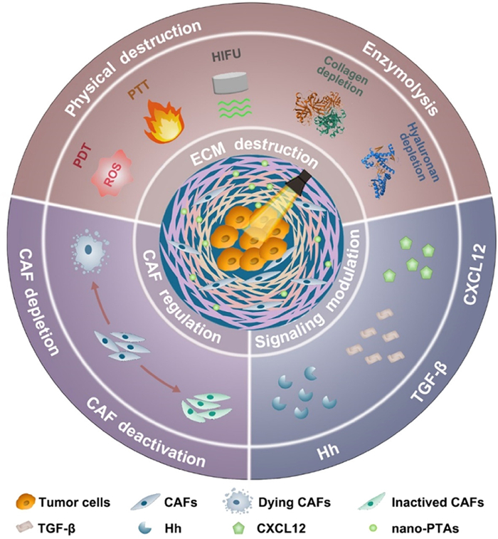 In a recent study [68], a nano-regulator based on a peptide-drug conjugate was developed to specifically target fibroblast activation protein-α (FAP-α) overexpressed CAFs. Meanwhile, ICG was loaded in the nano-regular employed to induce hyperthermia. The nano-regulator effectively downregulates the expression of alpha-smooth muscle actin (α-SMA) and FAP-α. Additionally, fibronectin and collagen Ⅰ are significantly reduced after laser irradiation. In combination with ataxia-telangiectasia mutated inhibitor-induced CAF normalization, the nano-regulator causes dysfunction of CAF barriers, further decreasing tumor stiffness and altering ECM structure.