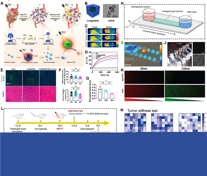 The excessive production and abnormal organization of ECM lead to tumor stiffening and elevated solid stress. These physical barriers severely impede the efficient delivery of anticancer agents within tumor tissues. Numerous studies have shown that PTT can change the tissue mechanics. Marangon et al. [66] investigated tumor stiffness and integrity after carbon nanotubes (CNTs)-mediated PTT. Employing second harmonic generation microscopy (SHG), they found that collagen fibers were not observed nearby CNTs after 30 min and 1-day post-irradiation, implying the damage on collagen structure induced by the local heating. Notably, although tumor sites exhibit transient and reversible stiffening during irradiation, tumor tissues show significant softening in the following days. Xiong et al. [67] utilized atomic force microscopy to evaluate the Young's modulus of tumors. The Young's modulus of tumor sections treated with mild PTT is 22.89 kPa, much lower than that of the control group (42.52 kPa). Moreover, a decreased tumor stress is observed after PTT treatment, which helps normalize blood vessels (Figs. 2LO).