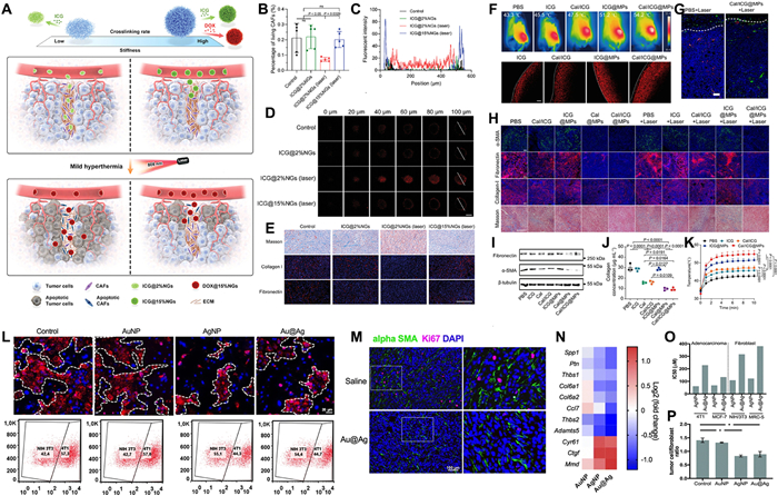 Figure 3  CAF regulation-induced enlarged tumor penetration for nano-PTA delivery. (A) Illustration of softness-aided hyperthermia regulates tumor mechanics and facilitates the afterwards administrated stiff nanomedicine. (B) Percentage of living CAFs after PTT treatment by ICG-loaded nanogels with different stiffness. (C) Semi-quantitative of fluorescence intensity in tumor spheroid along direction in (D). (D) Penetration of RhB@15%NGs nanogels in tumor spheroids after PTT. (E) Masson, collagen Ⅰ and fibronectin staining of tumor tissues after PTT. Reproduced with permission [88], Copyright 2024, Wiley. (F) Thermal and fluorescence images of tumor-bearing mice after different administration. (G) CD8 and α-SMA staining in tumor tissues after various treatment. (H) α-SMA, fibronectin, and collagen-I and Masson staining of tumor tissues after treatment. (I) Western blot analysis of fibronectin and α-SMA level in myofibroblasts. (J) Relative collagen content in myofibroblasts. (K) Temperature curves of tumor-bearing mice after different treatment. Reproduced with permission [95]. Copyright 2022, Springer Nature. (L) Fluorescence images and flow cytometric analysis of co-cultured 4T1 and NIH/3T3 cells. (M) α-SMA staining of tumor sections treated after Au@Ag. (N) Gene analysis of the genes linked to metastasis-related protein products secreted by CAFs. (O) Half maximal inhibitory concentration (IC50) of 4T1 cells and NIH/3T3 cells after incubation with different metal materials. (P) The ratio of tumor cells to fibroblasts in the tested co-cultures. Reproduced with permission [98]. Copyright 2020, BioMed Central.