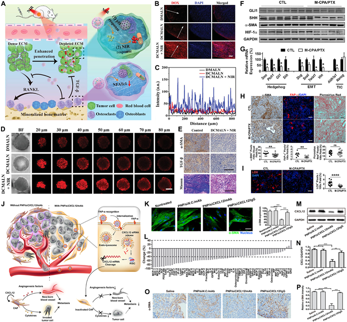 Figure 4  Signaling pathway regulation-induced enhanced tumor permeability for nano-PTA delivery. (A) Illustration of TGF-β suppression combined with PTT in tumor permeability enlargement. (B) Fluorescence images and (C) semi-quantitative distribution of tumor sections treated with different groups. (D) Fluorescence images of DOX-loaded nanoparticles penetrated into tumor spheroids treated with different formulations. (E) α-SMA, TGF-β, and Masson staining of tumor sections of different treatment groups. Reproduced with permission [114]. Copyright 2023, Wiley. (F) Western blot analysis and (G) mRNA levels of Shh and hypoxia proteins. (H) α-SMA, FAP-α staining and dual-immunofluorescence staining of different treatment groups. (I) LOX immunofluorescence staining of tumor sections. Reproduced with permission [118]. Copyright 2018, Elsevier. (J) Illustration of the peptide nanoparticles (PNP)/siCXCL12/mAb nanosystem induced CAF inactivation. (K) Immunofluorescence staining of α-SMA in CAFs in different groups. (L) Differential cytokine expressions of CAFs detected by proteome array chip. (M) Western blot analysis and (N) quantitative analysis of CXCL12 expression in CAFs. (O) Immunohistochemistry staining and (P) quantitative analysis of α-SMA in tumors. Reproduced with permission [121]. Copyright 2019, ACS.