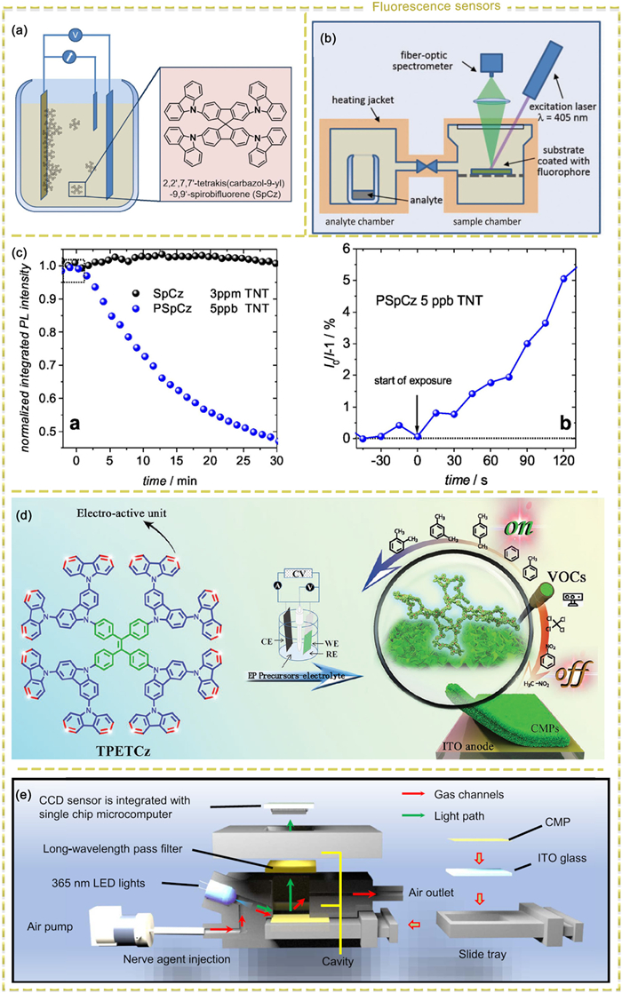 Figure 4.  (a) The principle behind electrochemical polymerization involves forming a microporous network, PSpCz, from a monomer solution of SpCz. Copied with permission [135]. Copyright 2016, Nature Publishing Group. (b) The setup for characterizing the photoluminescence of sensors. Copied with permission [135]. Copyright 2016, Nature Publishing Group. (c) A schematic comparison of the integrated photoluminescence intensity response between SpCz and PSpCz under different TNT exposure levels. Copied with permission [135]. Copyright 2016, Nature Publishing Group. (d) The molecular structure of TPETCz and the electrochemical polymerization process of CMP films. Copied with permission [40]. Copyright 2020, Wiley Publishing Group. (e) The schematic internal components of the portable detection system. Copied with permission [45]. Copyright 2022, Nature Publishing Group.