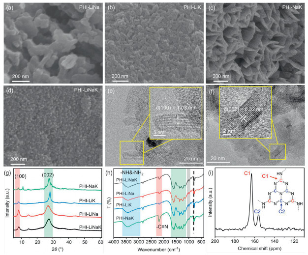 Figure 1  (a-d) SEM image of PHI-LiNa, PHI-LiK, PHI-NaK and PHI-LiNaK. (e, f) HR-TEM image of PHI-LiNaK. Inset: Enlargement of the selected area. (g) Powder XRD patterns, (h) FT-IR spectra of PHI-LiNaK, PHI-LiNa, PHI-LiK and PHI-NaK. (i) Solid-state 13C NMR spectrum of PHI-LiNaK.