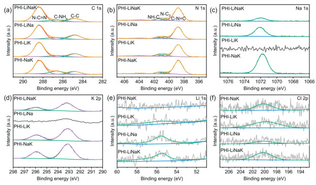Figure 2.  XPS results of high-resolution spectra of C 1s (a), N 1s (b), Na 1s (c), K 2p (d), Li 1s (e) and Cl 2p (f) of PHI-LiNaK, PHI-LiNa, PHI-LiK and PHI-NaK.