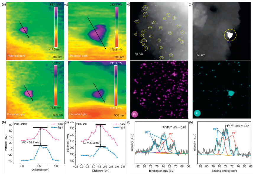 Figure 4.  (a) KPFM images of PHI-LiNaK in dark and light. (b) The surface potential of PHI-LiNaK before and after irradiation. (c) KPFM images of PHI-LiNa in dark and light. (d) The surface potential of PHI-LiNa before and after irradiation. (e) TEM image and element mapping of PHI-LiNaK. (f) Pt 4f XPS spectra of PHI-LiNaK. (g) TEM image and element mapping of PHI-LiNa. (h) Pt 4f XPS spectra of PHI-LiNa.