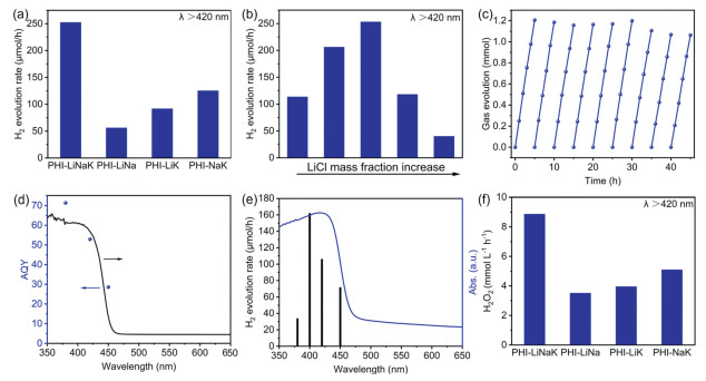 Figure 5.  (a) Photocatalytic H2 evolution rates of different molten salts. (b) Photocatalytic H2 evolution rates of various PHI-LixNaK. (c) Stability test of H2 evolution activities of PHI-LiNaK. (d) Wavelength dependence of H2 evolution rate of PHI-LiNaK (The distance from the LED lamp head to the liquid surface is 23 cm. LED lamps: λ = 380 nm, 507 µW/cm2; λ = 400 nm, 4093 µW/cm2; λ = 420 nm, 1972 µW/cm2; λ = 450 nm, 2286 µW/cm2). (e) Wavelength-dependent AQY of PHI-LiNaK. (f) H2O2 production rates of different molten salts.